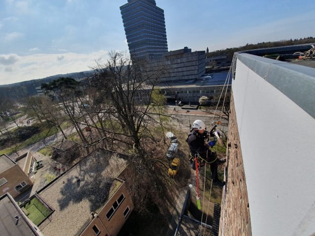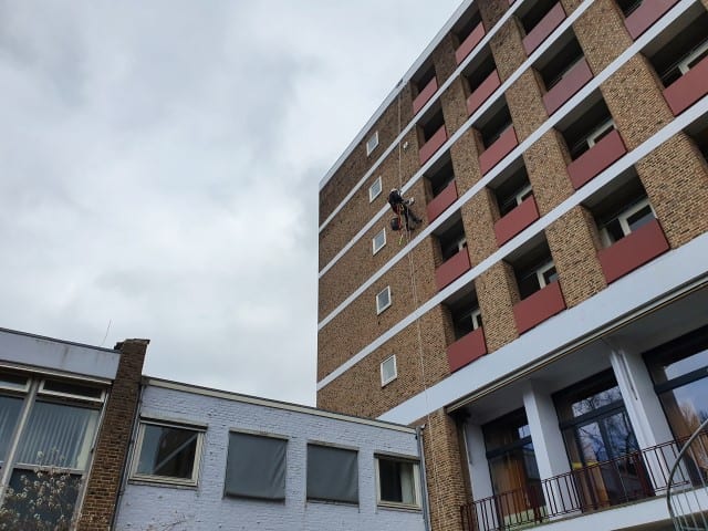 In opdracht van Plegt Vos Oost heeft A.T.I. Abseiltechnieken op een aantal gevels exclusion flaps voor vleermuizen geplaatst. Deze flaps garanderen een eenrichtingsverkeer van dieren zodat ze na hun winterslaap de gevel uit kunnen en voor de sloop van het gebouw er niet meer in kunnen. Enkele locaties waren voor standaard hoogwerk methodes moeilijk bereikbaar, hiervoor was het toepassen van onze abseiltechnieken een goed alternatief. Onze rope access monteurs konden zich eenvoudig bij de moeilijk bereikbare locaties positioneren om zodoende ook op deze locaties de exclusion flaps te plaatsen.