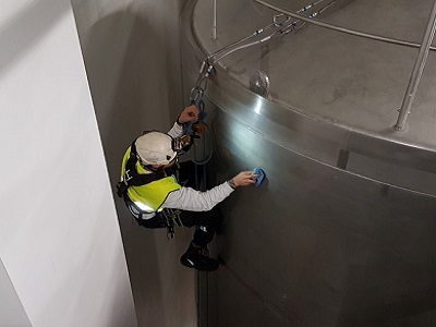 Reinigen zuivelfabriek door industrieel abseilen rope access IRATA